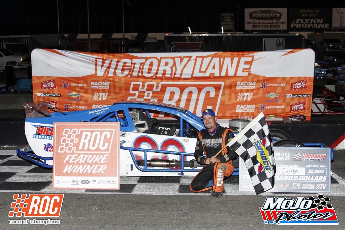 Chemung, N.Y. – (July 19, 2025) – Zack Curren of Horseheads, N.Y., delivered a powerful and emotional performance on Saturday night at Chemung Speedrome, capturing the win in the Race of Champions Sportsman Modified Series “Tribute to Ed McGuire 51.” Curren competed in a tribute car honoring his friend, Connor Sellars, who passed away unexpectedly earlier this year.
